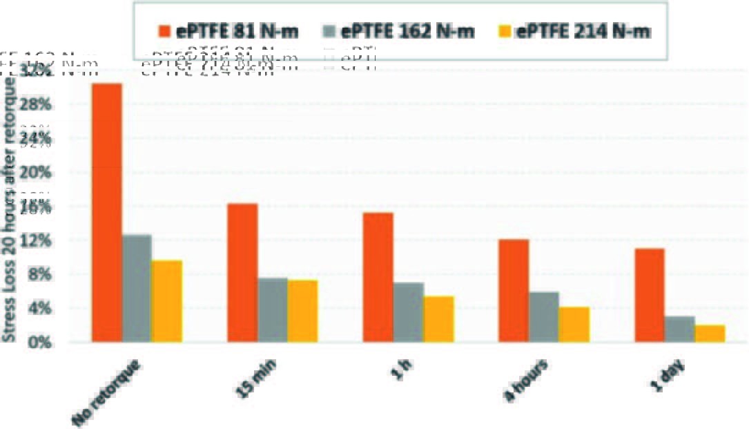 Additionally, the study looked at the im-pact of under and over-tightening on relaxation and load retention for two of the materials, spiral wound gaskets and ePTFE. In Figure 4, one can see the ePTFE stress loss results for torque levels of 60 ft-lbs (81 N-m), 120 ft-lbs (162 N-m), and 158 ft-lbs (214 N-m). These torques equate to approximately 37%, 75%, and 98% of bolt yield, respectively.