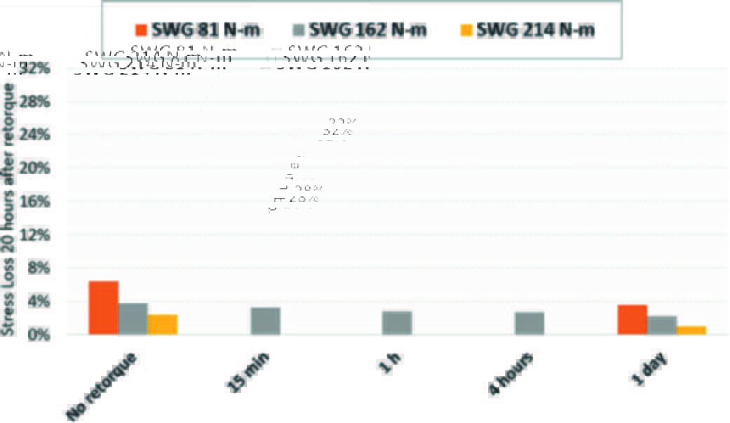 The spiral wound gasket (a low-load relaxation gasket) also performed as expected (Figure 5), showing a considerably lower impact on load retention when under or over-tightened, resulting in minimal differences in gasket stress concerning the retorque dwell time. As a result, not all of the dwell time intervals were tested for the additional torque levels.