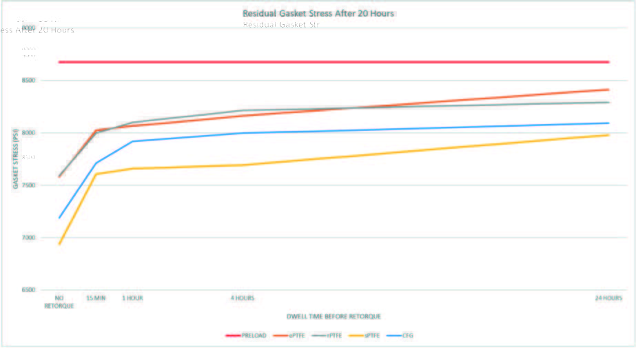 The gaskets were installed per ASME guidelines and a retorque was applied at the determined dwell times. After 20 hours, the retained gasket stress was measured to determine the overall loss from preload. A control sample that was not retorqued at all was used as a baseline to measure against.